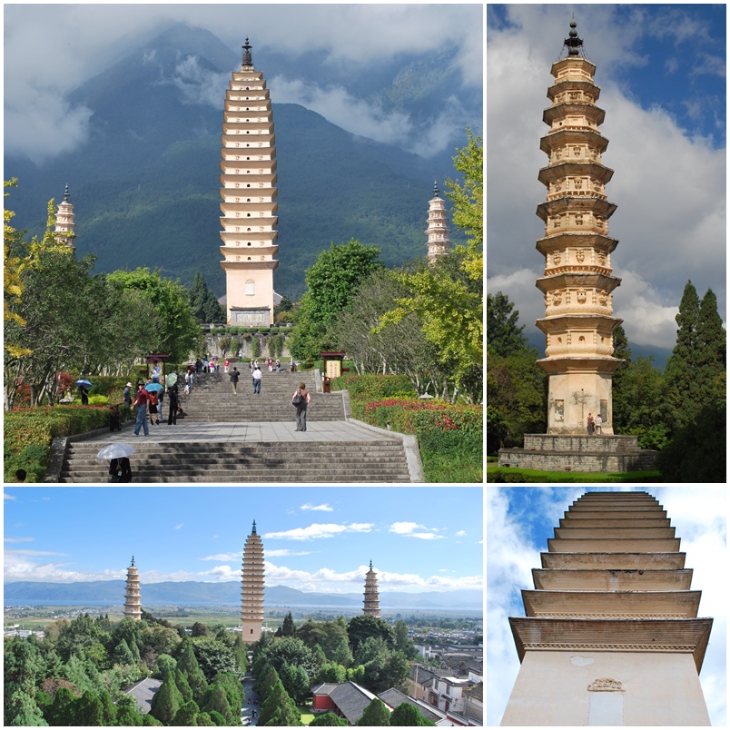 The next day we visited the Three Pagodas and then a famous Bai Teahouse on the way out of town. The Three Pagodas (San Ta) were top of my to-do list for Dali. The largest of the three is almost 1200 years old and dates from when Dali was a Buddhist kingdom. The smaller (not small!) pagodas lean in a Pisa-like fashion – took a while to realise they were crooked, not the photos! Behind the pagodas is a large temple compound (Congshen Temple) but we didn’t spent any time there. It was rebuilt recently (starting in 1986) to repair damage from earthquake, fire, and the Cultural Revolution. We just stopped into the first hall, to see the golden Guanyin statues.