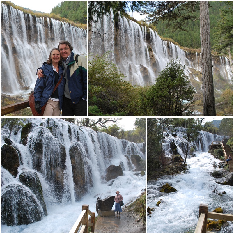 We rode back down to the top of Shuzheng Valley and followed a walking path from the road down to the Nuorilang Waterfalls. (See the top two pics below). The Nuorilang Falls are 20m high and 320m long. The path wound along beside them, through large fir trees. The wooden walking paths really are fantastic – solid and a good 1.5m wide in most places, they weave through the forest, around lakes and over waterfalls. Most are well separated from the main road.