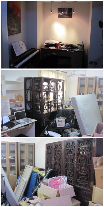 Study/Studio – a.k.a. the “junk room”. The dark wood furniture, the folded up ping pong table, and pretty much anything not in a brown packing box belongs to the landlady and will be gone in December. I’ve given up on trying to get it organised and set up before then. Eventually I plan to have a futon in there for guests.