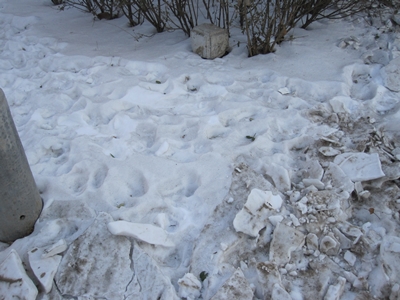 Everything is frozen. All water – including small spills, mud puddles, and gobs of phlegm on the footpath – are solid. Thin patches crunch underfoot; anything more solid can be slippery. My hair was damp when I went out this afternoon (the power was off in our building so no hairdryer!) and in the 10-15 minutes I was outside my bobbed ponytail under my hat was crunchy! It was much colder then than when I went home at 9:30pm, even thought the internet tells me than an hour later at 10:30pm it was -3 (windchill -11), on the way to a low of -12. It definitely felt colder than that in the wind this afternoon!
