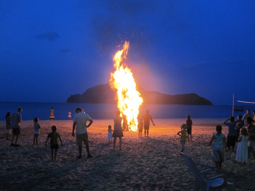 A whole bunch of kids were running around and as the evening grew a little darker, they started chanting “Fire! Fire! Fire!” – impatiently awaiting the lighting of the bonfire. Made of dried palm branches, it reminded me of the “beacon” in the movie Madagascar and went up nearly as quickly! Lots of bats swooping around, lots of green lights in the bay, and a generally great evening. Finished up playing 3 on 3 football in the pool with some TCKs from Cambodia and India.