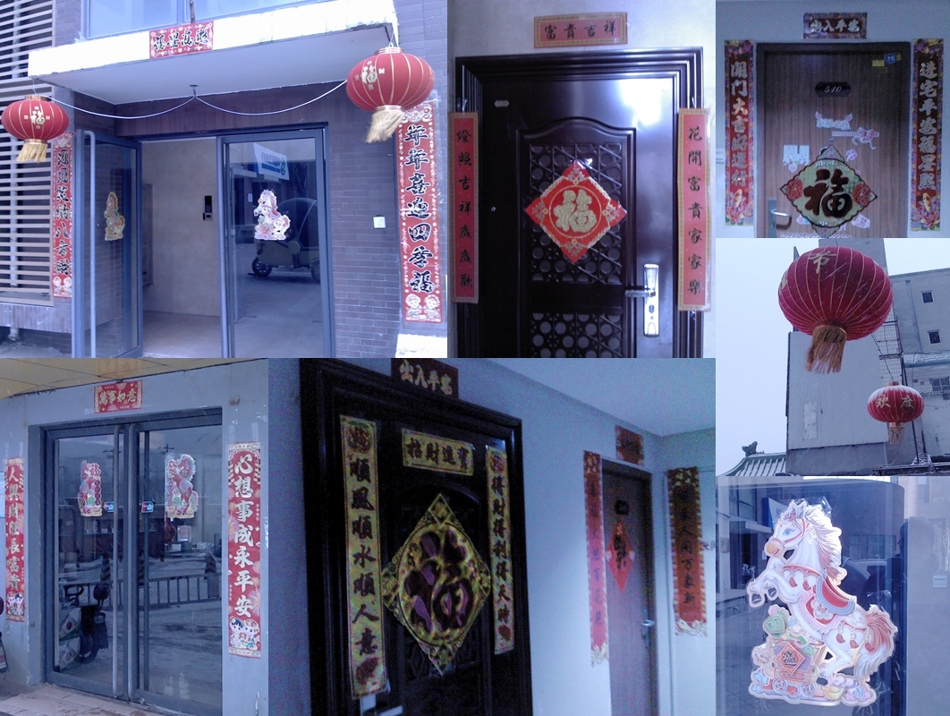 Even more common than circular paper-cut designs on windows are doorway decorations – diamond-shaped 福, long and narrow 对联 (duì lián), stylised horses (this year’s zodiac animal), and at larger doors, red lanterns and sometimes chains of fake firecrackers. You can’t walk around China at this time of year without seeing decoratiosn like these everywhere – around the doors of homes and businesses, in the subway, sometimes even on the fronts of cars or trucks. Of course, the vast majority are red, with black and/or gold writing. It’s all very fun and festive!