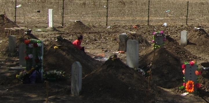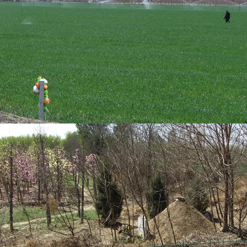 The graves I’ve seen in rural northern China usually have a high mound of dirt, sometimes with a flat-ish stone or other item on top. There is almost always a rectangular tombstone with carved inscriptions in front, usually facing due south. In farmland it’s not uncommon to see a modest grave mound at the end of a cultivated field, perhaps in the corner, occasionally in the middle. The first notice I really took of qing ming jie was when I saw farmers burning offerings and laying garlands on these mounds in cultivated land by the side of the highway between Beijing and Langfang. Until then I hadn’t recognised that the mounds I’d seen were in fact graves. In the city itself these are of course quite scarce, but the area I live in now is rural enough that these traditional graves and graveyards are still easily seen.