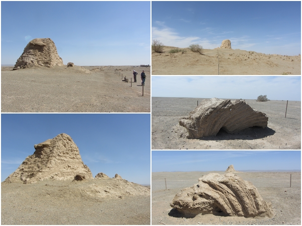 Yumen Scenic Area was my favourite attraction of all we saw in and around Dunhuang. It is in the desert about 90km (55mi) northwest of Dunhuang, and has three main sites to visit, plus the road out to the Yadan landforms (but that’s so far away we chose not to visit). It was a frontier area, with the wall built (and soldiers stationed) there to protect the local people from marauding nomads known as the Xiongnu (this people group may have been Huns, but historians aren’t sure). Now it is eerily deserted.