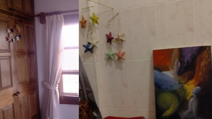 Stars hanging in by the window where I stayed my first few days, and next to a painting in my bedroom here.