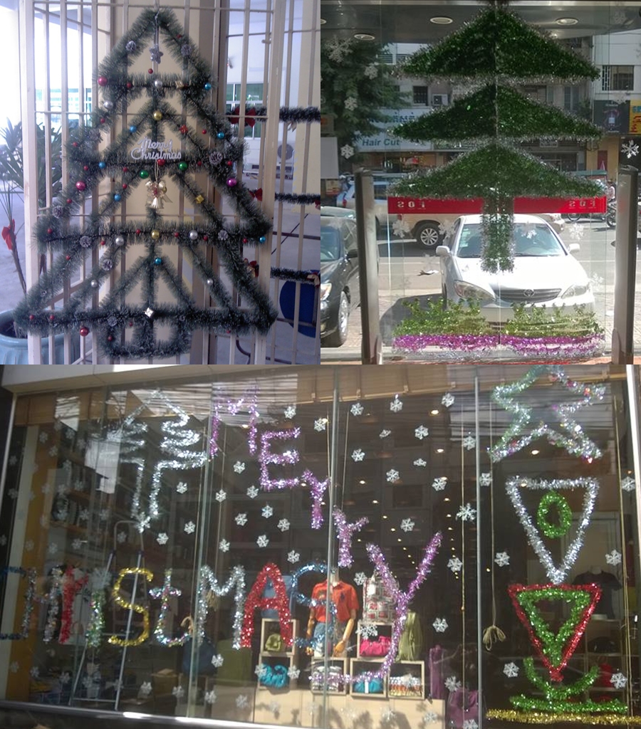 While this is the first year I’ve been in Cambodia for Christmas, I’ve visited in early Janaury quite a few times. There is a lot of consumer Christmas here too – lights and decorations and music. But there’s also something fun I’ve not seen elsewhere: tinsel trees. Lots of businesses tape strings of tinsel to glass windows and doors in the shape of Christmas trees. Every year they seem to get more elaborate in size, shape, and decoration. They started as simple outlines (and many still are) but there are some very elaborate uses of tinsel flying around! I think it’s really quite clever, and some of them are really very nice.