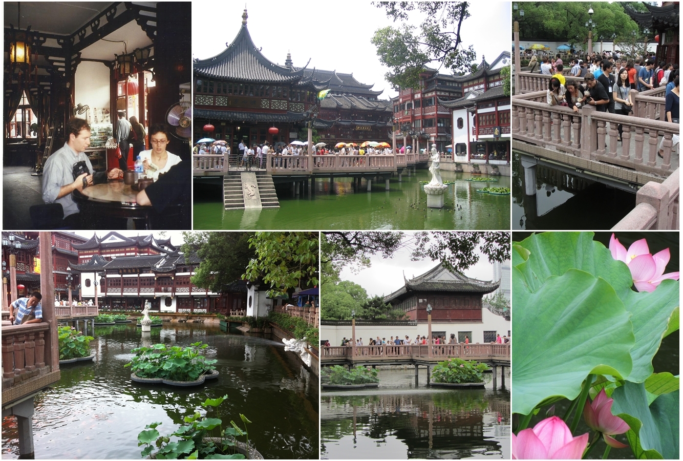 Huxin Pavilion outside the gate to Yu Gardens. Top left: sitting in the Huxin Pavilion teahouse, October 1999; top centre: the pavilion itself, July 2004; top right: zigzagging walks, June 2012. Bottom row: the lotuses of lotus lake in June 2012.