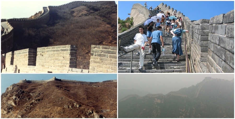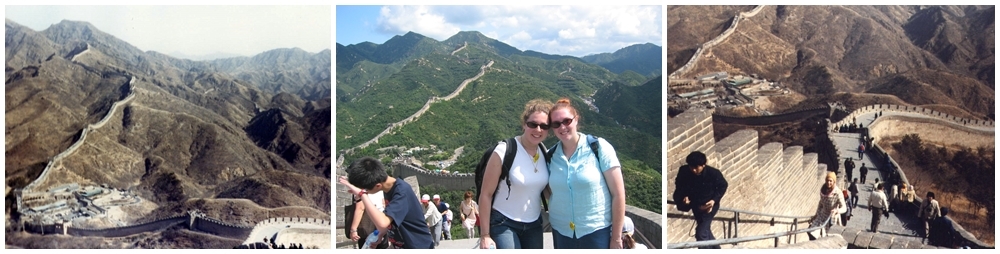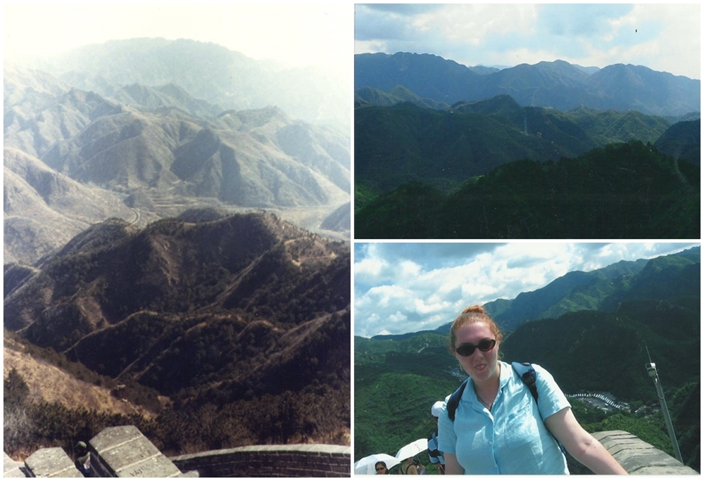 The main entrance to Badaling is in a valley, and you can climb up the wall either direction – to the east or west. In 1983 my parents climbed the western side of Badaling. I climbed the western wall twice – with my friend Amanda in August 2004, and with my friend Esther in June 2012. Esther and I went late in the afternoon on a smoggy day so while we got some amazing photos, most of them aren’t much use for comparisons. Amanda and I visitied on a sunny summer day. My parents visited at the end of winter, when the vegetation was more brown, and the air only lightly smoggy. the contrast between the different photos is striking.